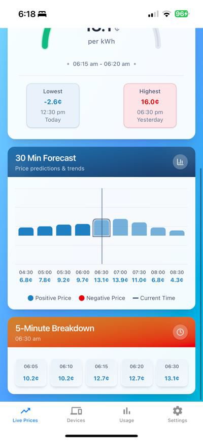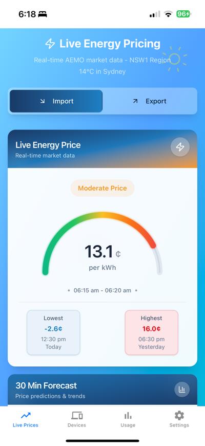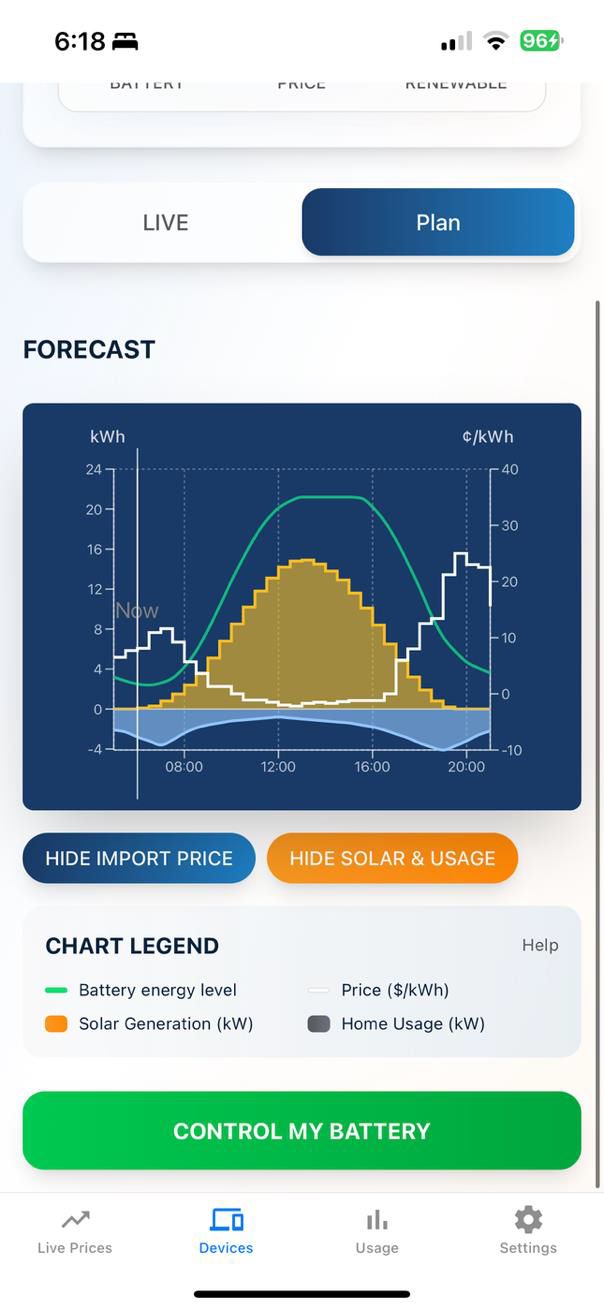 Residents see live prices and home energy in one app. Using price, weather, PV and usage forecasts, the system creates and executes an optimal battery plan, visualising savings and curves with manual override at any time.